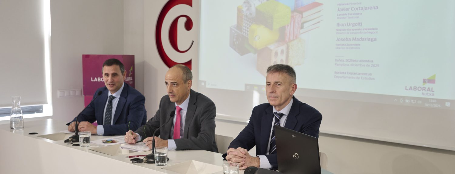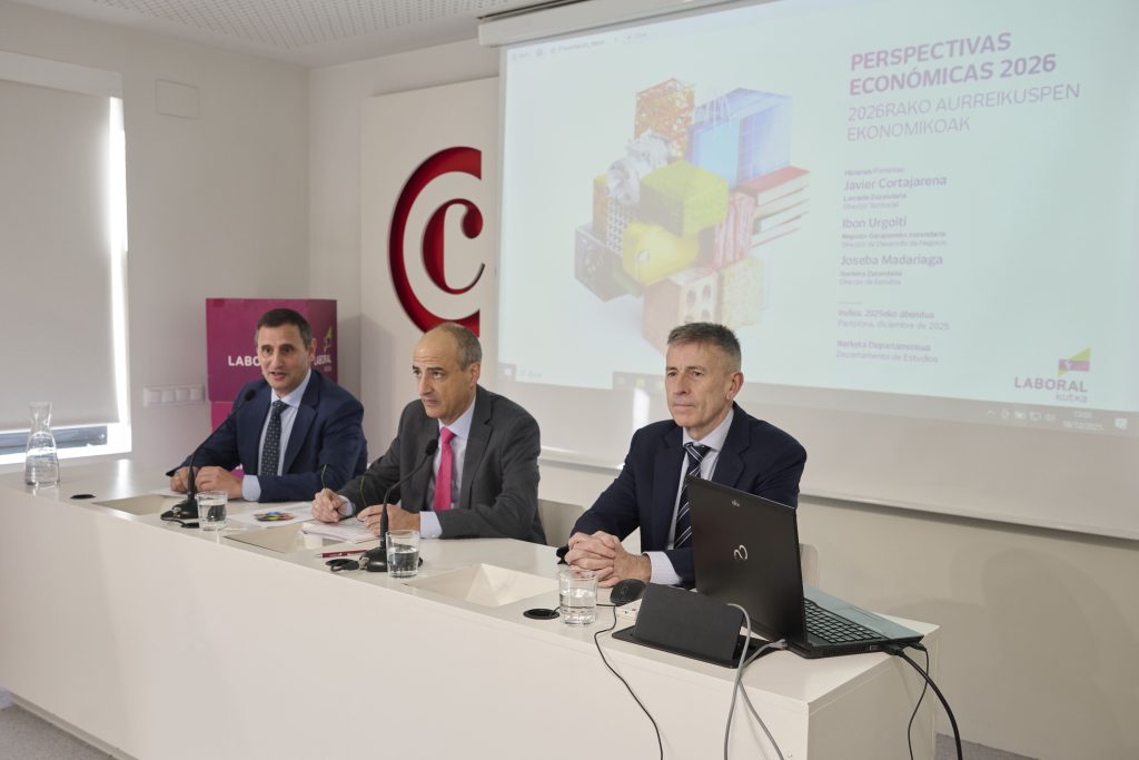 LABORAL Kutxa ha presentado las previsiones económicas para el año 2026, para el ámbito de la Comunidad Autónoma del País Vasco y la Comunidad Foral de Navarra. Joseba Madariaga, director del Departamento de Estudios e Ibon Urgoiti, director del Área de Desarrollo de Negocio, han comparecido primero en Bilbao y posteriormente en Pamplona, donde también ha participado Javier Cortajarena, director Territorial de Navarra.
